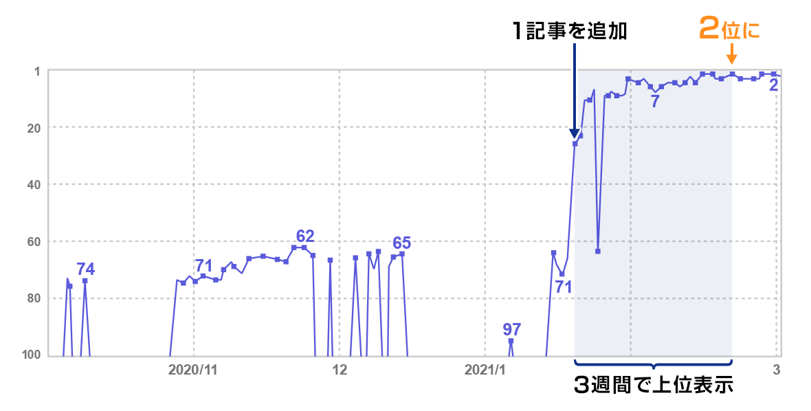 競合ひしめく激戦のビッグワードだったこともあり、上位表示までに数ヶ月は要すると考えていましたが、その記事は公開から3週間で2位表示を達成し、月間のトラフィックを15万PV近く押し上げることとなりました。
